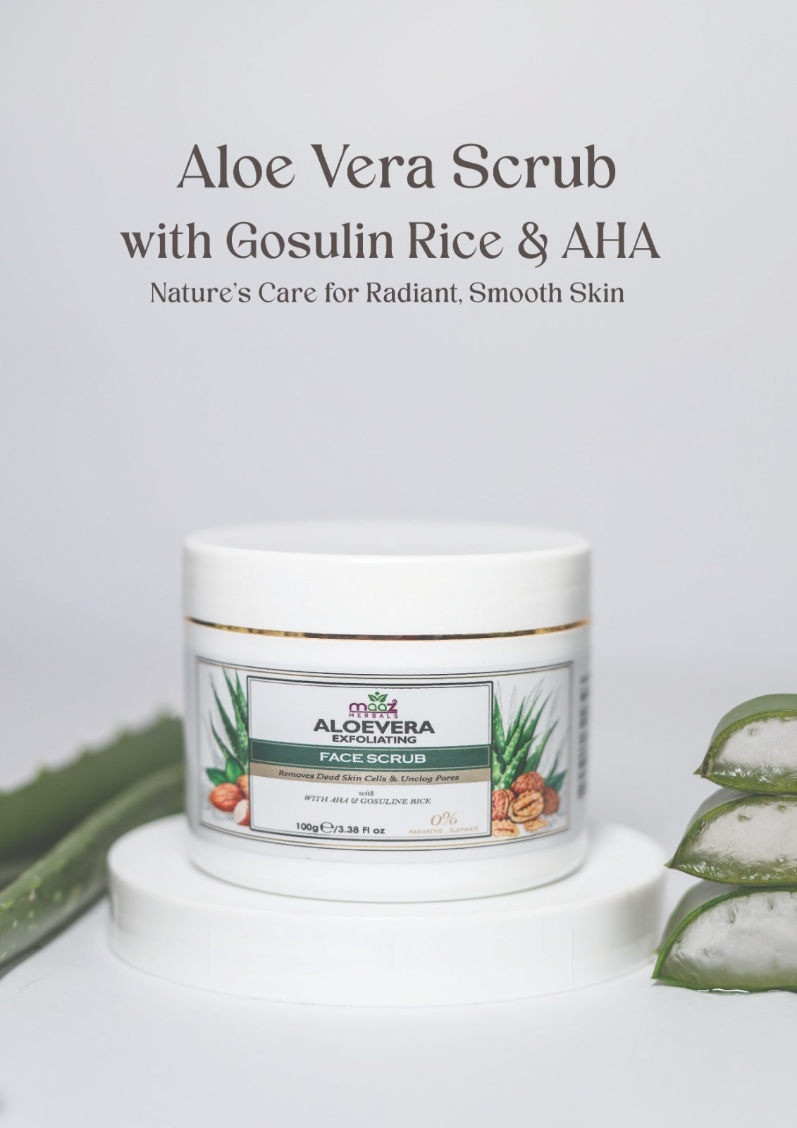 100% paraben-free and enriched with the finest natural ingredients, our Aloe Vera Exfoliating Facescrub is designed to gently cleanse and exfoliate without causing irritation. With a blend of Aloe Vera, Almond Oil, Gosuline Rice, Walnut Shell Powder, and AHA, this scrub nourishes your skin, smooths its texture, and reveals a brighter, more radiant complexion.