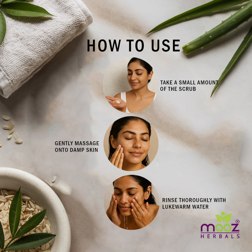 Take a small amount of the scrub and gently massage onto damp skin in a circular motion.