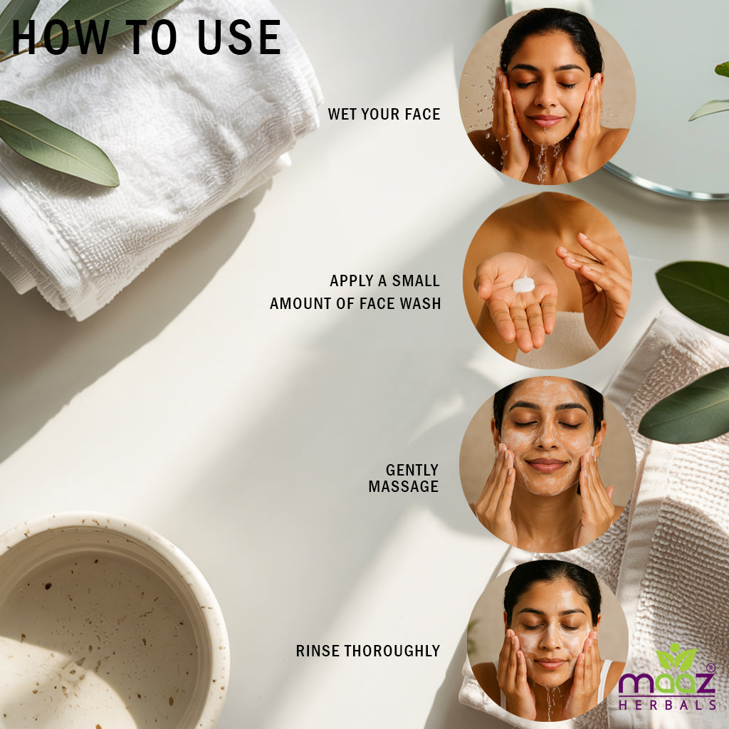Apply a small amount of face wash to your hands and gently massage onto your face in circular motions.